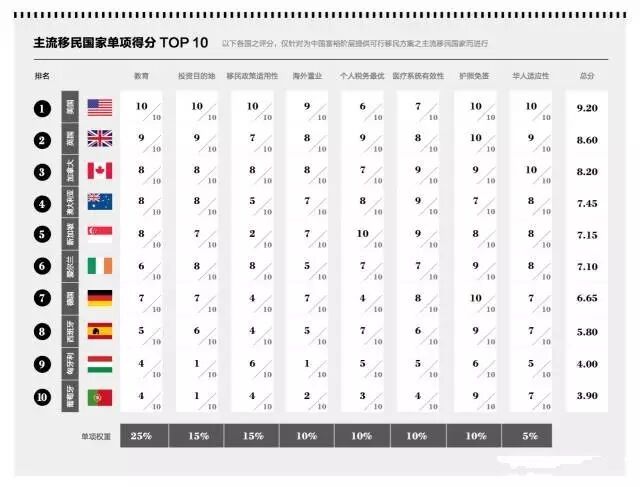 美国、英国和加拿大成为最适合中国高净值人群投资移民的国家,其次是澳大利亚和新加坡,爱尔兰首次进入前十。根据胡润研究院原创的“中国移民指数”,胡润表示:“这个指数从8个方面评选出最适合中国高净值人群投资移民的国家,包括教育、投资目的地、移民政策、海外置业、纳税、医疗、免签和华人适应性。”