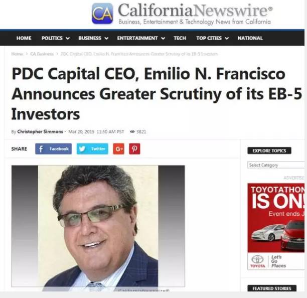 《加州新闻线》发表过文章,佛朗西斯科是PDC投资集团的CEO,PDC投资集团是专门从事EB-5投资移民的的公司,主要方向是房地产开发。