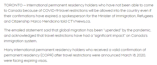 该声明说到:“拥有过期文件的申请人一旦被允许来加拿大,可能最终可以将其COPR延长,我们要清楚:他们将不必重新开始整个申请程序。”