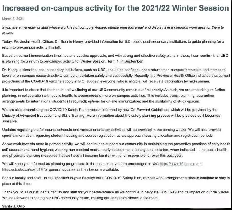 随着麦吉尔、SFU等多所加拿大高校接连官宣,准备在9月秋季入学时恢复线下授课,3月8日,UBC大学也给学生发了封邮件通知所有学生9月份要返回学校上课: