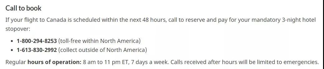 酒店预订方法: 加拿大政府官网明确说明,隔离酒店必须通过打电话进行预订!