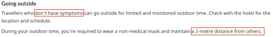 在酒店隔离期间,旅客不可以离开酒店房间,除非是基于紧急医疗、基本医疗服务和治疗或由政府官员授权理由;房间内不得有任何访客;禁止使用任何酒店共享设施(例如游泳池、健身房等)。