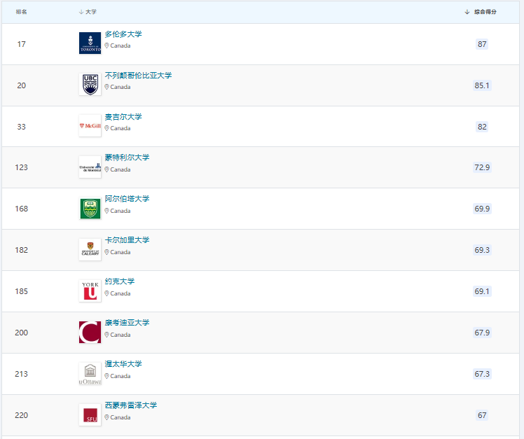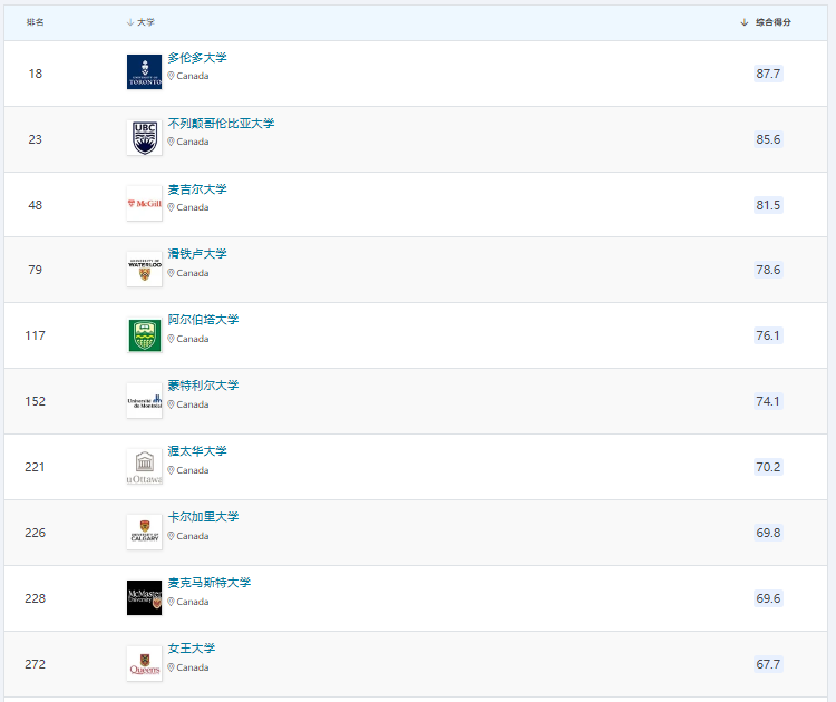 除此之外,在艺术与人文、工程与技术、自然科学、社会科学与管理、生命科学与医学五个领域,加拿大部分大学的排名情况如下。