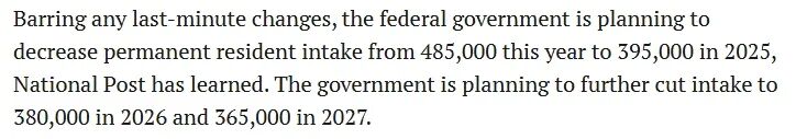 各个移民类别的人数都将受到影响。其中最多的削减预计是联邦经济类别的永久居民申请人,明年应减少约60%,然后在2026年和2027年再次小幅增加。